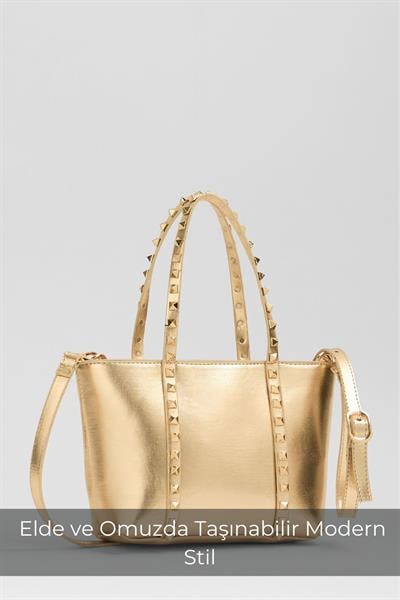 Madamra Altın Kadın Küçük Boy Zımba Detaylı PU Deri Tokalı El ve Omuz Çantası